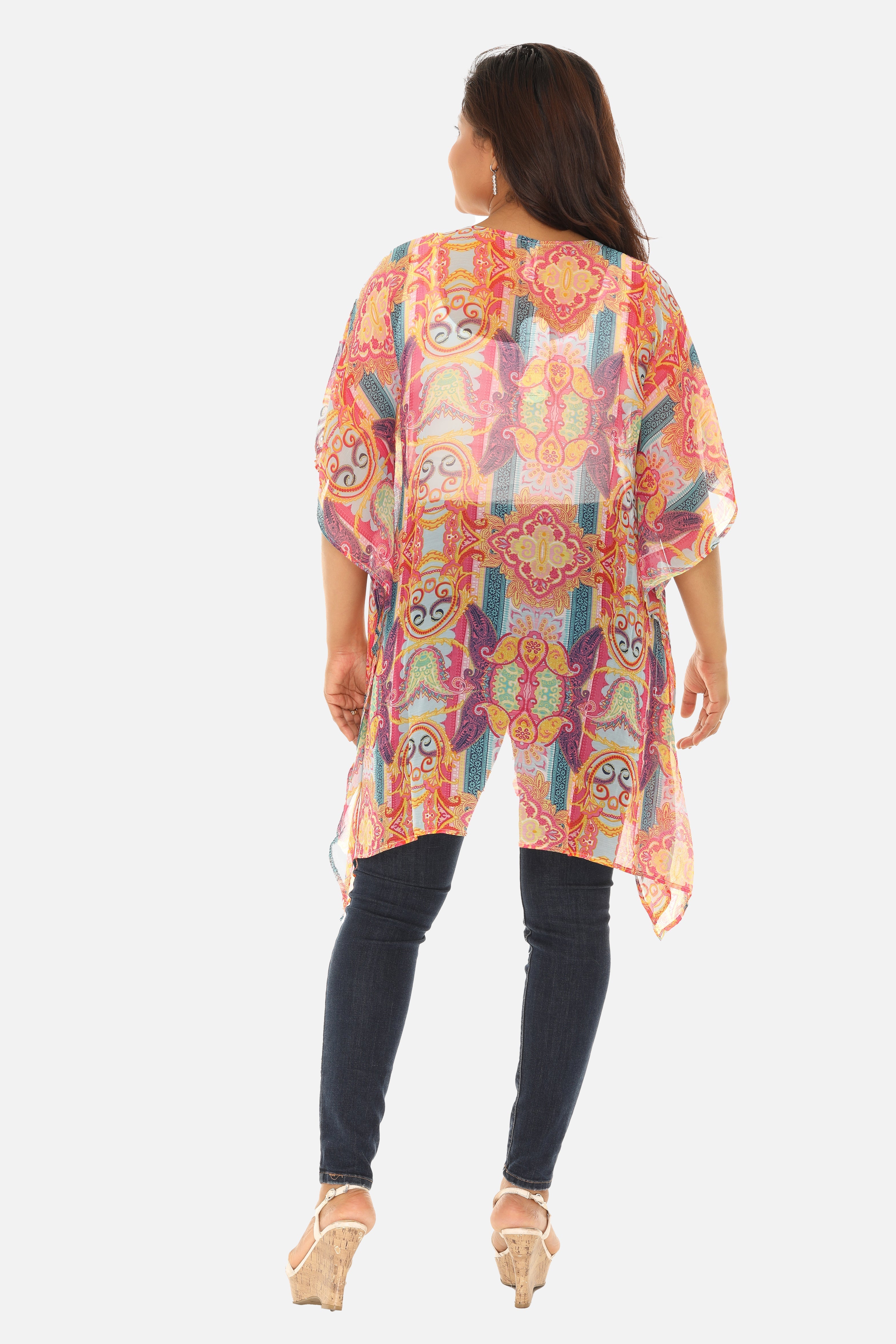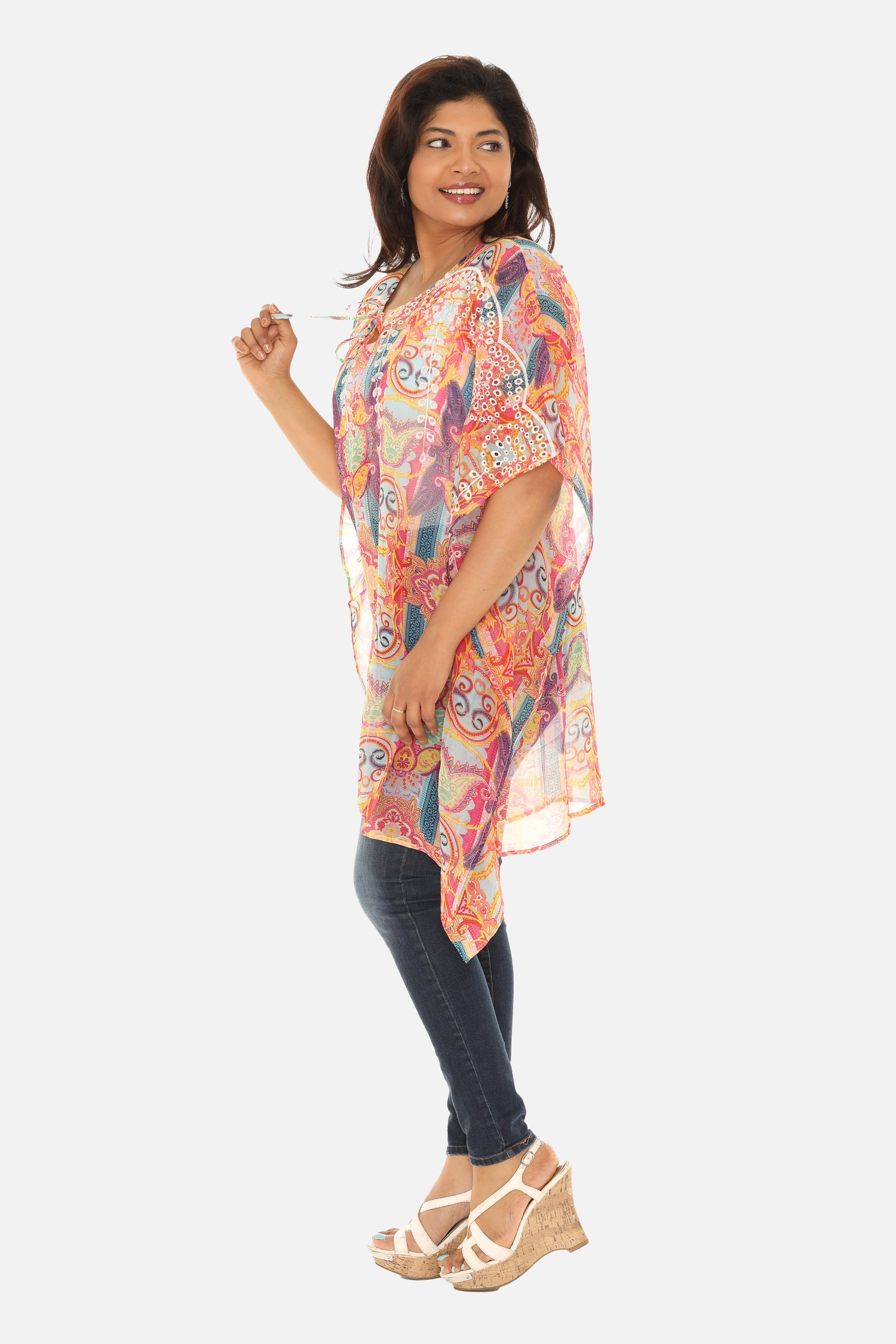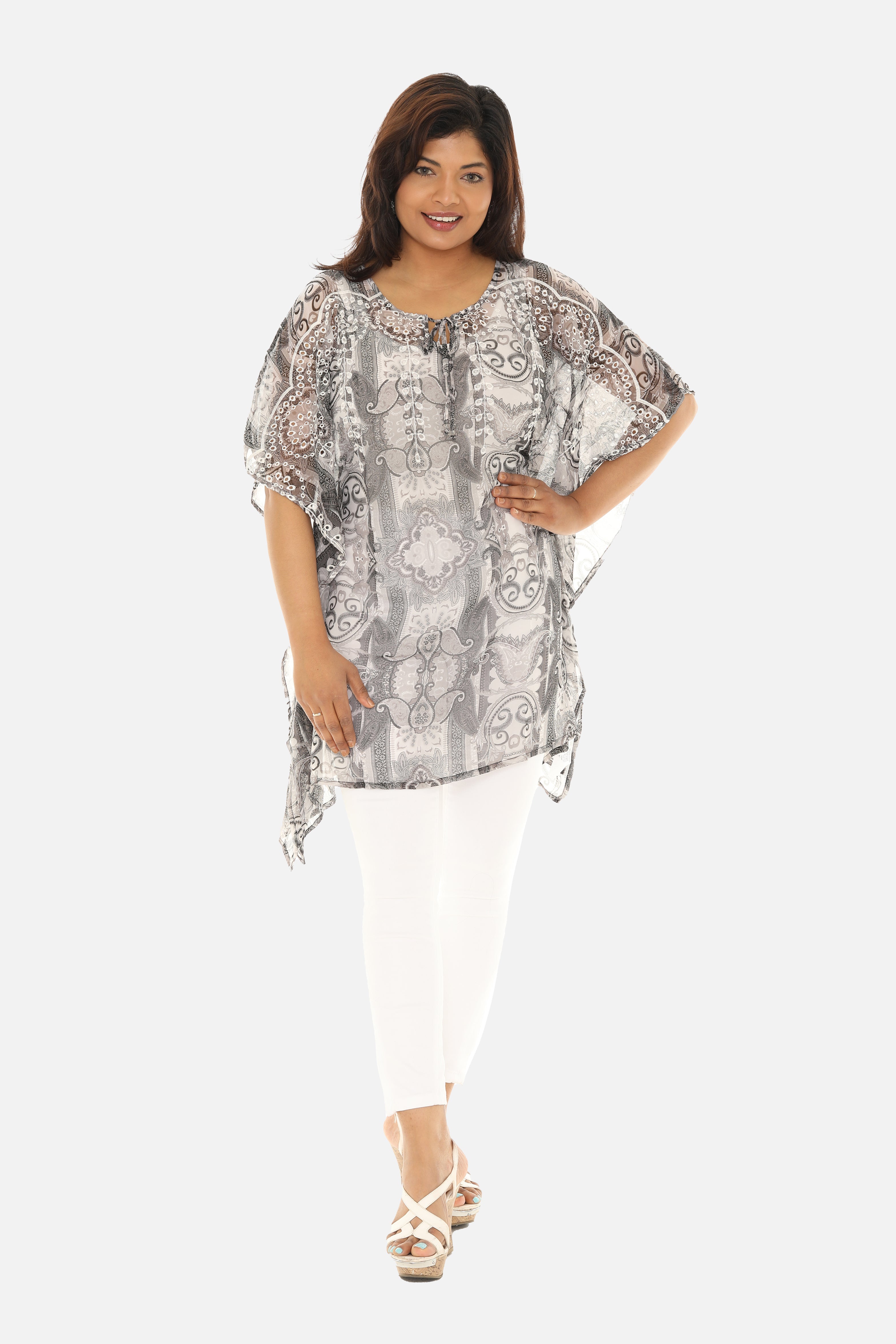 The V-neckline and lace-up detailing add a touch of elegance to this piece, while the loose fit and airy sleeves provide a relaxed and comfortable feel. The poncho-style design provides ample coverage, making it easy to wear over your swimsuit or as a standalone top.