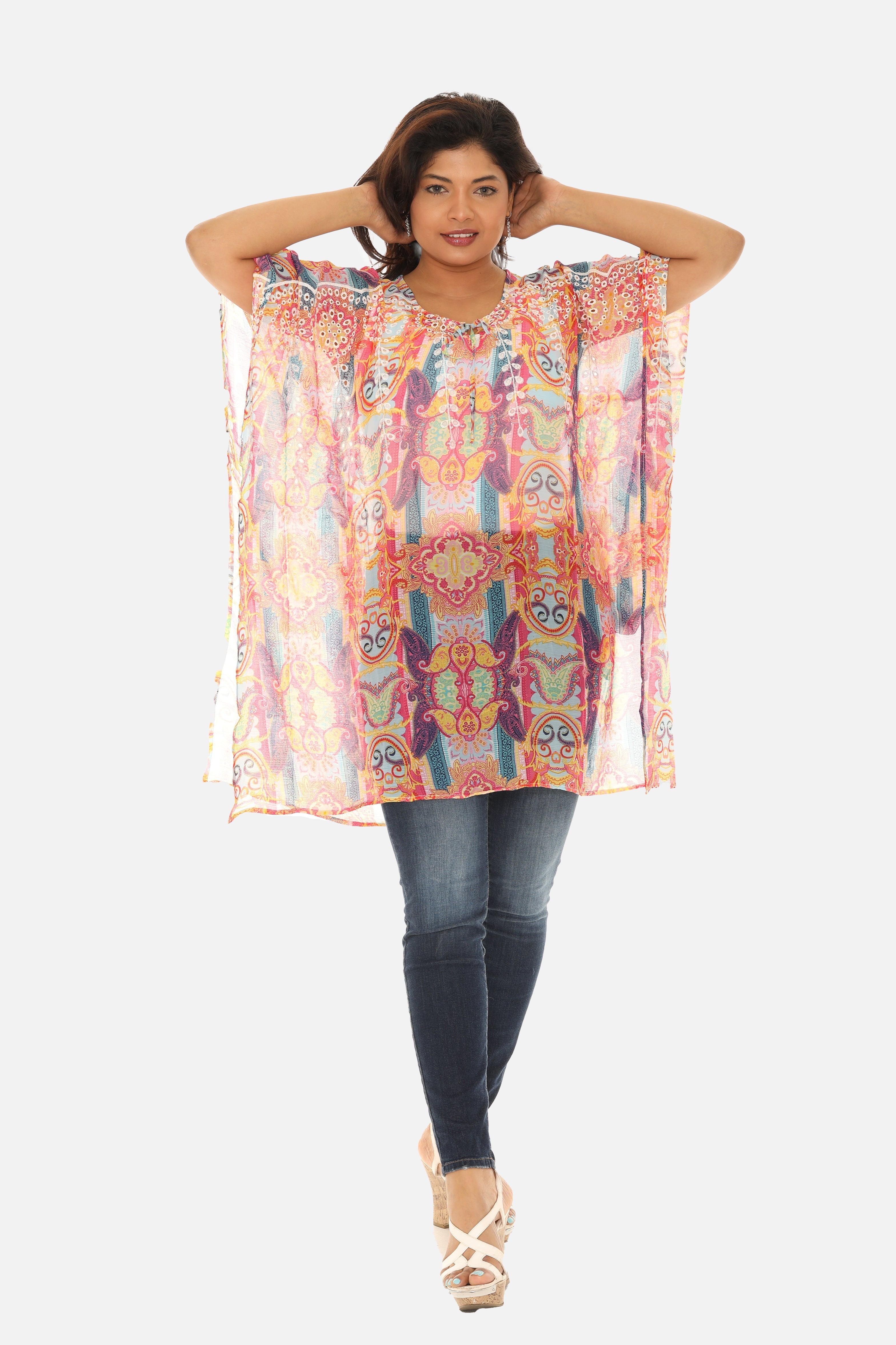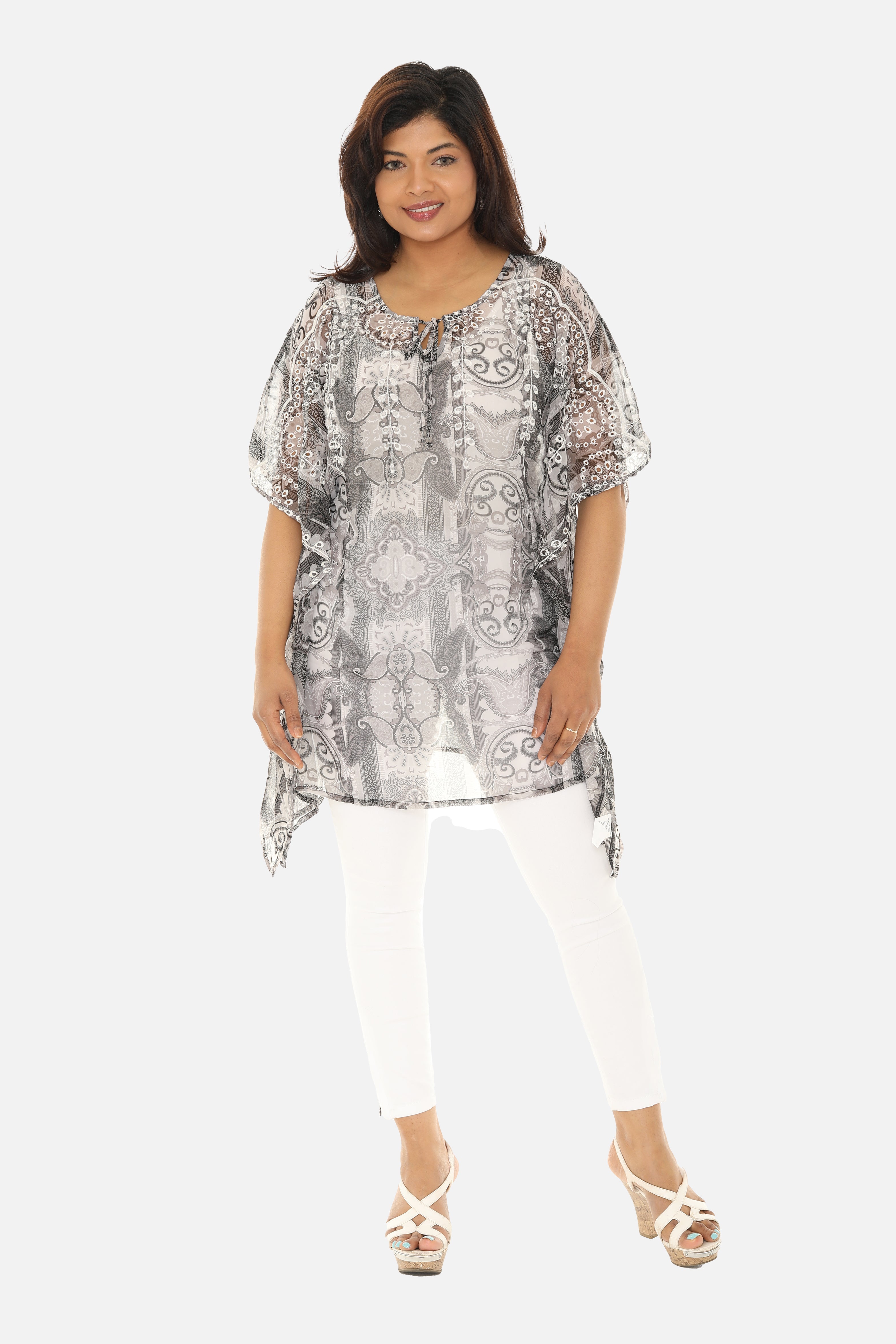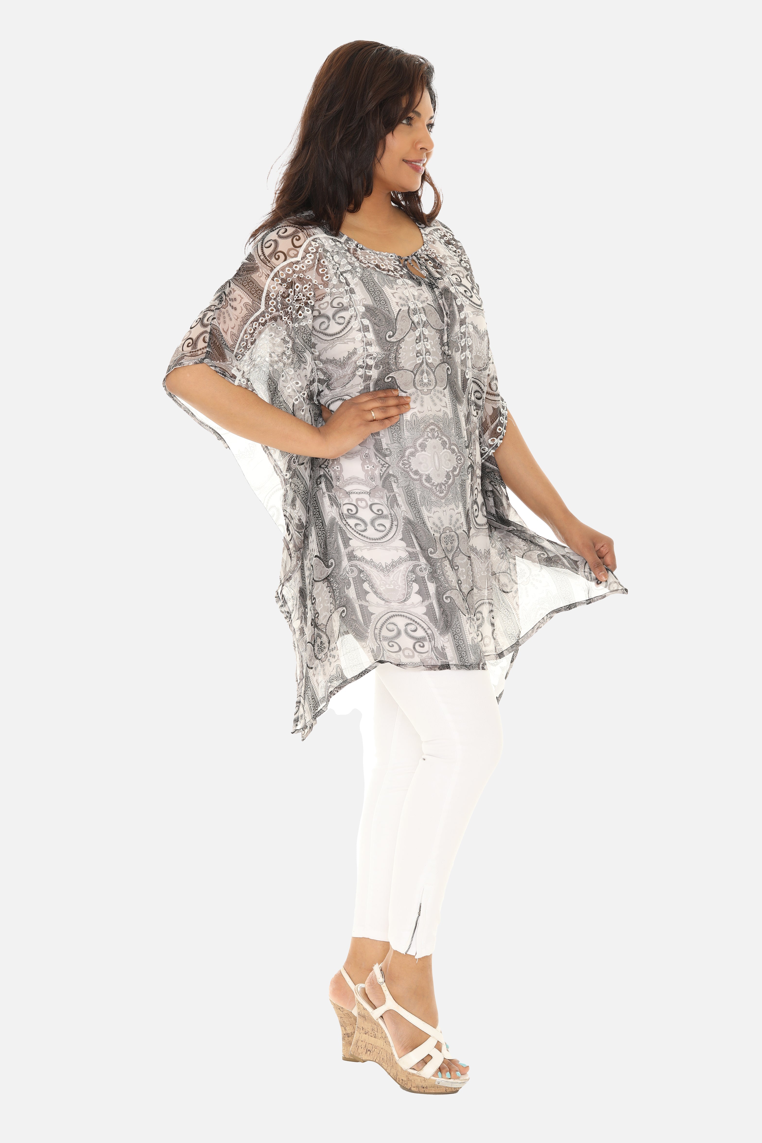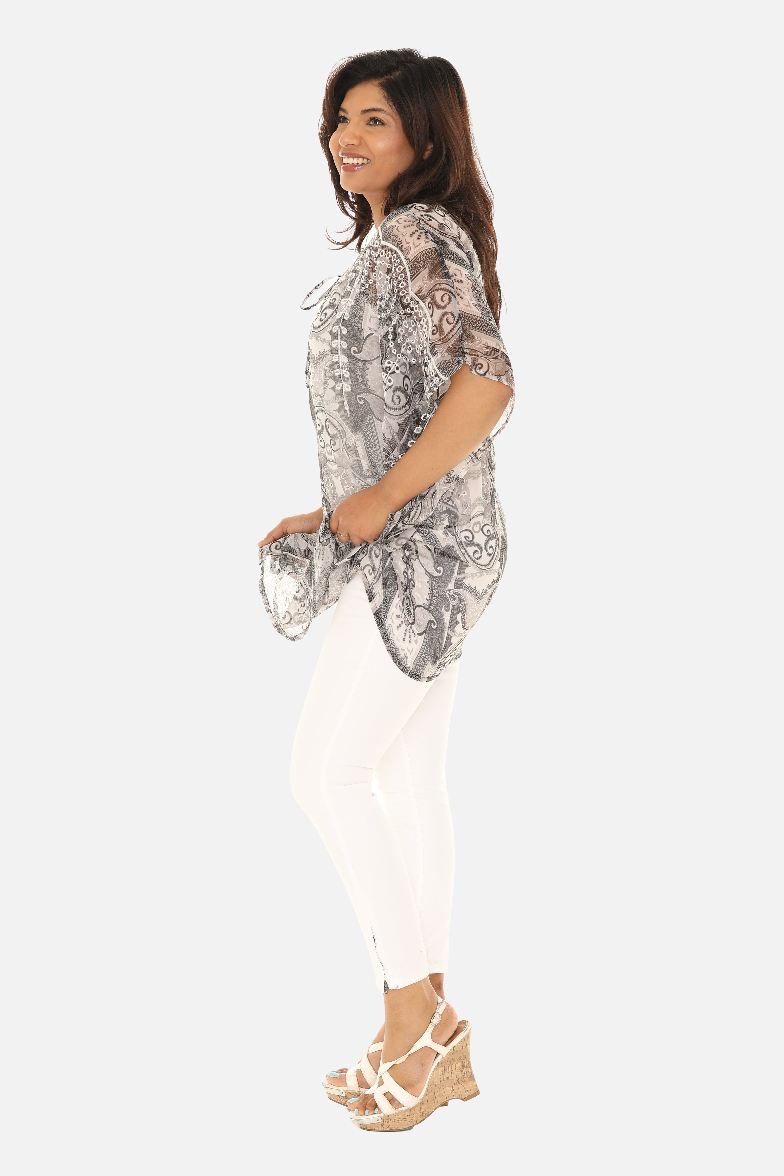 The V-neckline and lace-up detailing add a touch of elegance to this piece, while the loose fit and airy sleeves provide a relaxed and comfortable feel. The poncho-style design provides ample coverage, making it easy to wear over your swimsuit or as a standalone top.