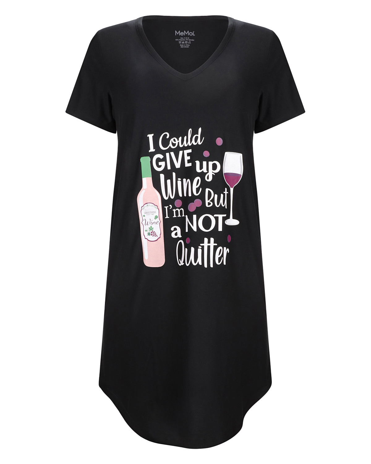 WARNING - our I Could Give Up Wine But I'm Not A Quitter Sleepshirt might make it difficult to get out of bed in the morning. Woven fabrics knit together to create a silky smooth, breathable jersey feel that keeps you cool and won't twist, turn, and bunch up overnight. Complete with a classic V-neck and cap sleeves that hits mid-thigh. Pair it with our Give Up Wine Non-Skid Low Cut Socks to complete the ultimate lounging look. This relaxed, roomy, and ridiculously soft silhouette is as essential as getting a full eight hours of sleep.