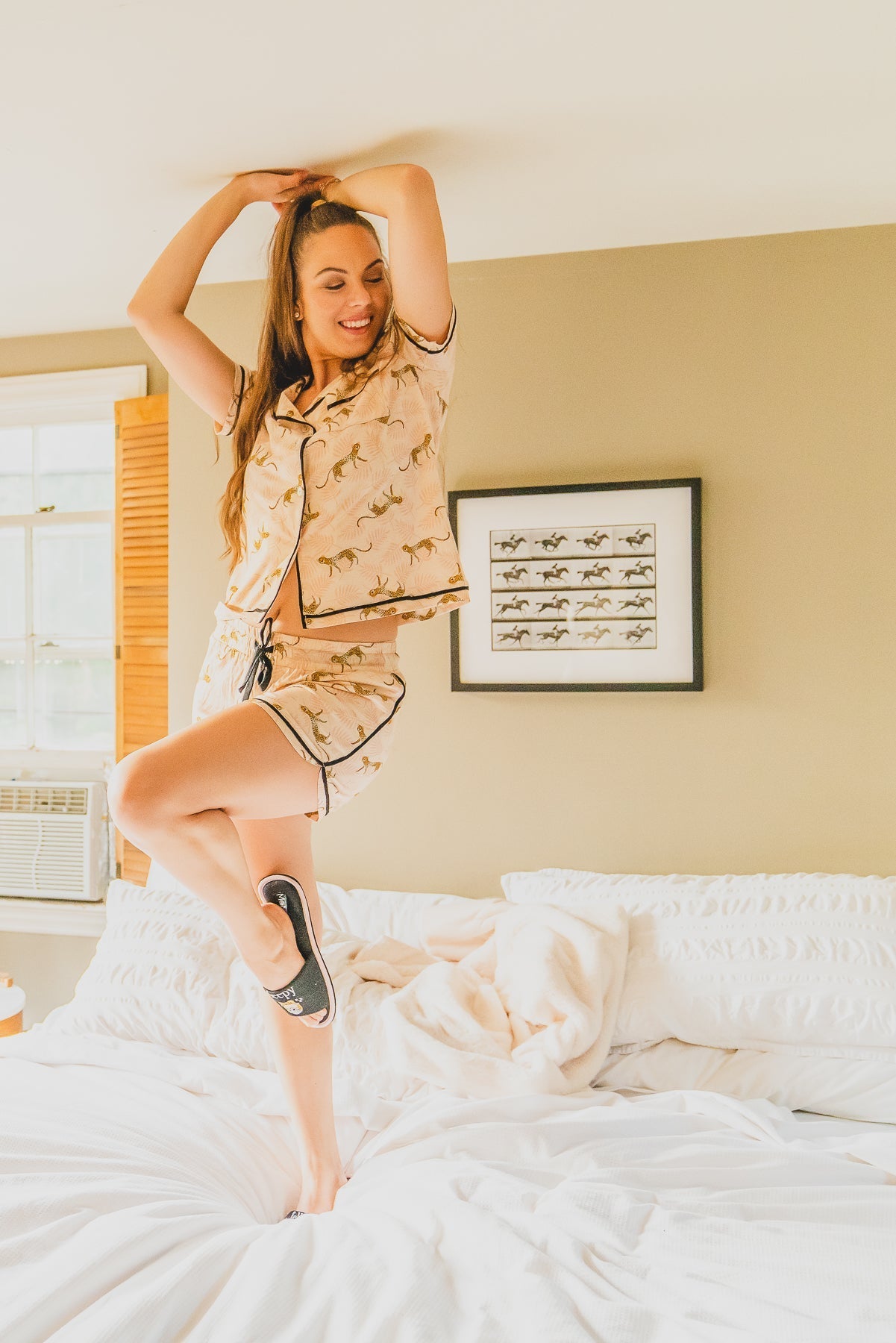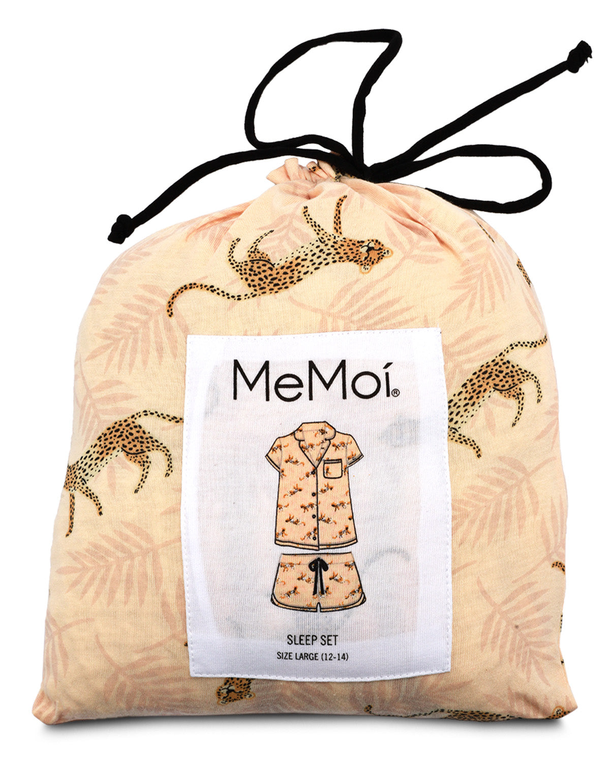 You're the queen of the pride in our Jungle Cat Notch Collar Pajama Pouch Set. Comfort? It's in the bag - literally. These super soft PJs come in their own matching gift pouch for a cozy treat any time of the year. This two-piece set is easy breezy with a stylish collared shirt and matching pajama shorts for a full sleep ensemble.