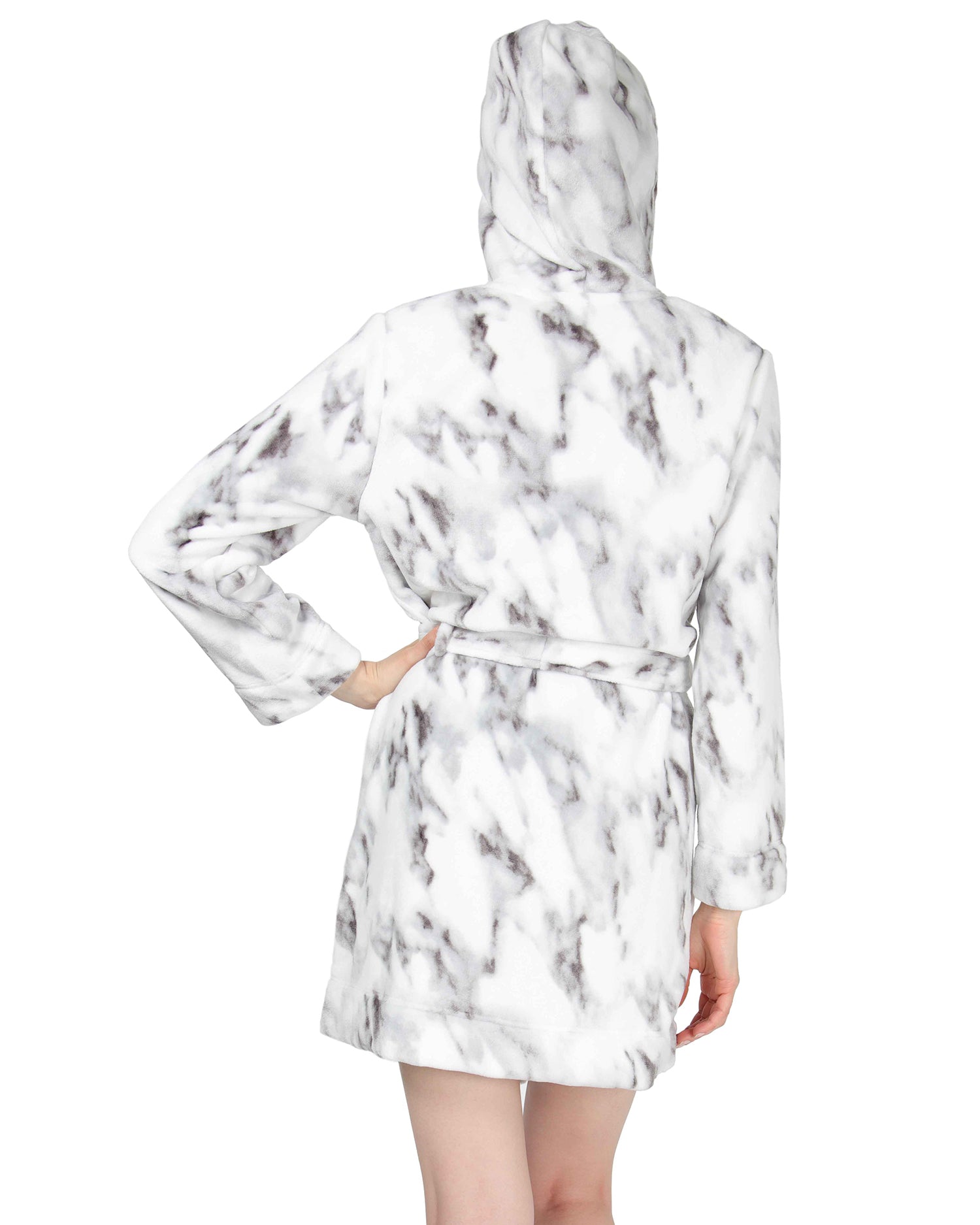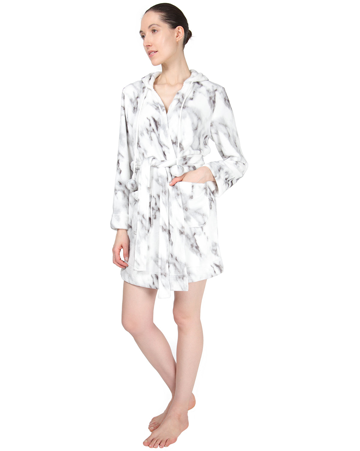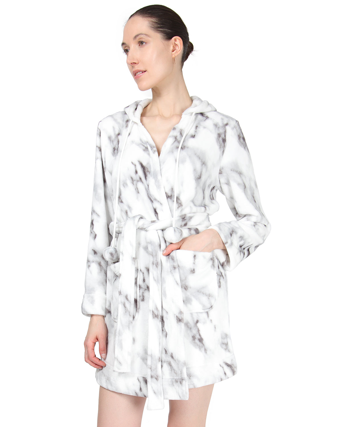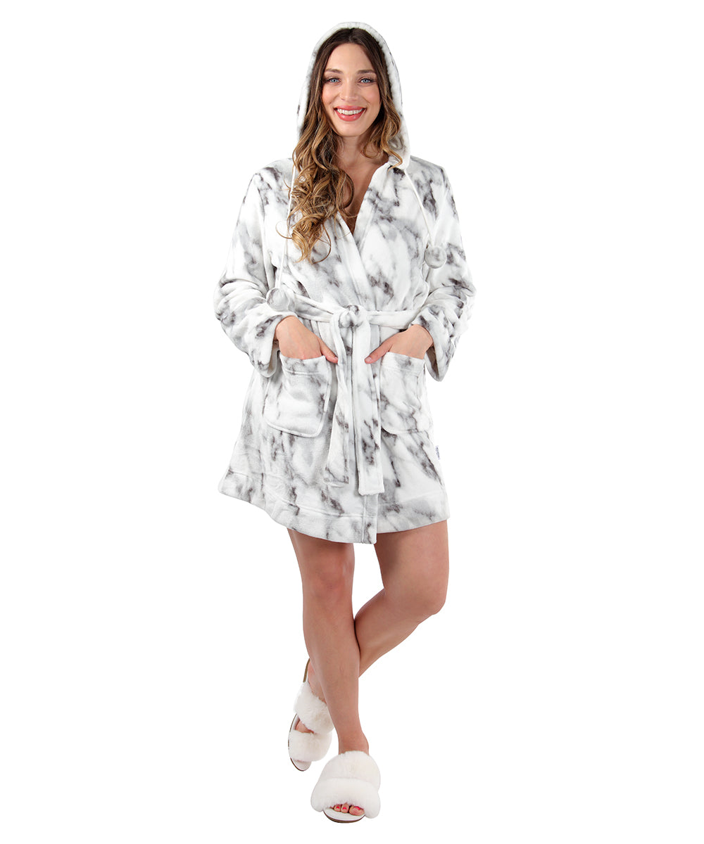 Women's Marble Plush Hooded Robe with Pom-Pom Drawstrings