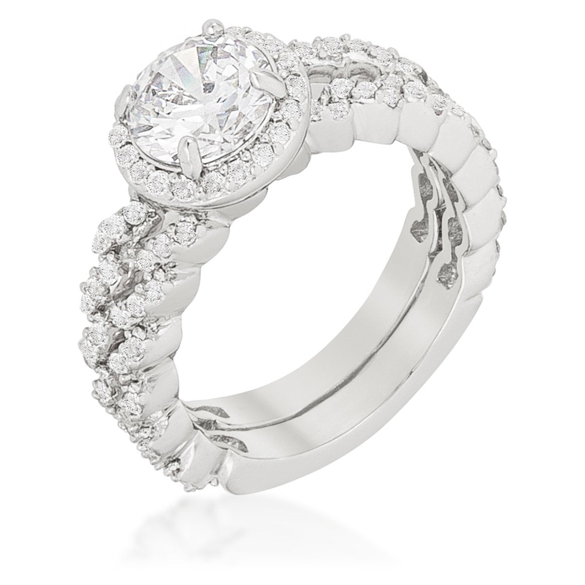 Elegant style is on display with this fabulous wedding set. Genuine Rhodium Plating is achieved using an electroplating process that coats the item with heavy layers of rhodium a close cousin to platinum which gives our jewelry a platinum luster.